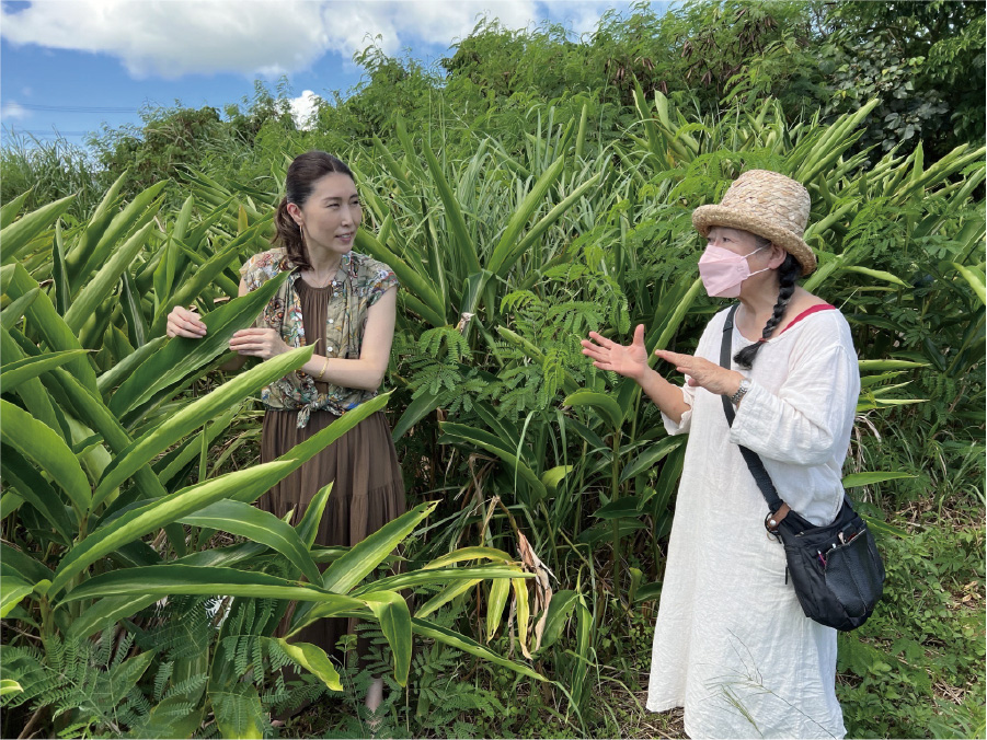 現在は、そのタイミングに合わせて収穫する「満月収穫」を行い、自然のリズムに合わせた月桃栽培をライフワークとして続けています。哲子さんの自然との向き合い方や月桃栽培へのこだわりに深く共感した友里さんは、すぐに親しくなり、チュランの運営などにも助言をいただいたりする仲に。
