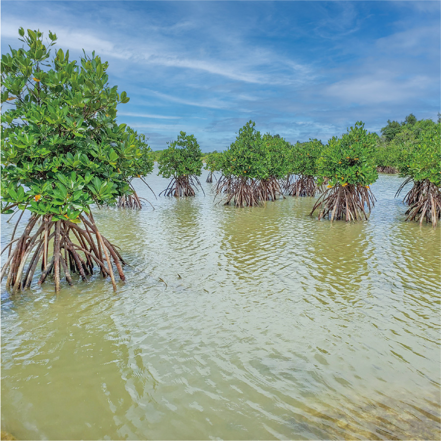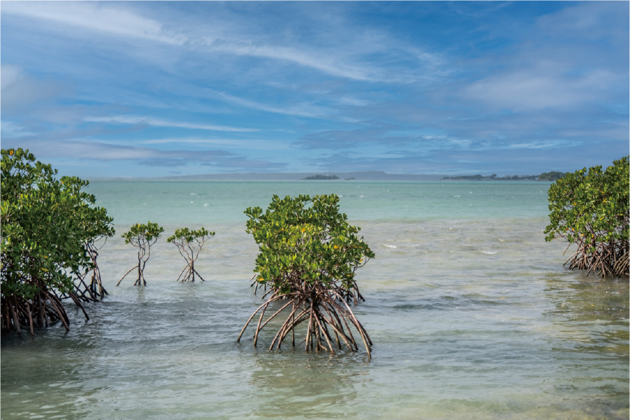 沿岸域に広がるブルーカーボン生態系は、海洋全体の二酸化炭素貯留の約8割を担うとされています。その面積当たりの二酸化炭素吸収速度は森林生態系に比べて5~10倍も高いとされ、優れた二酸化炭素吸収源として注目されています。主なブルーカーボン生態系には、藻場(海草・海藻)、干潟、塩性湿地、マングローブ林があり、これらの生態系は、多面的な価値も提供しています。
