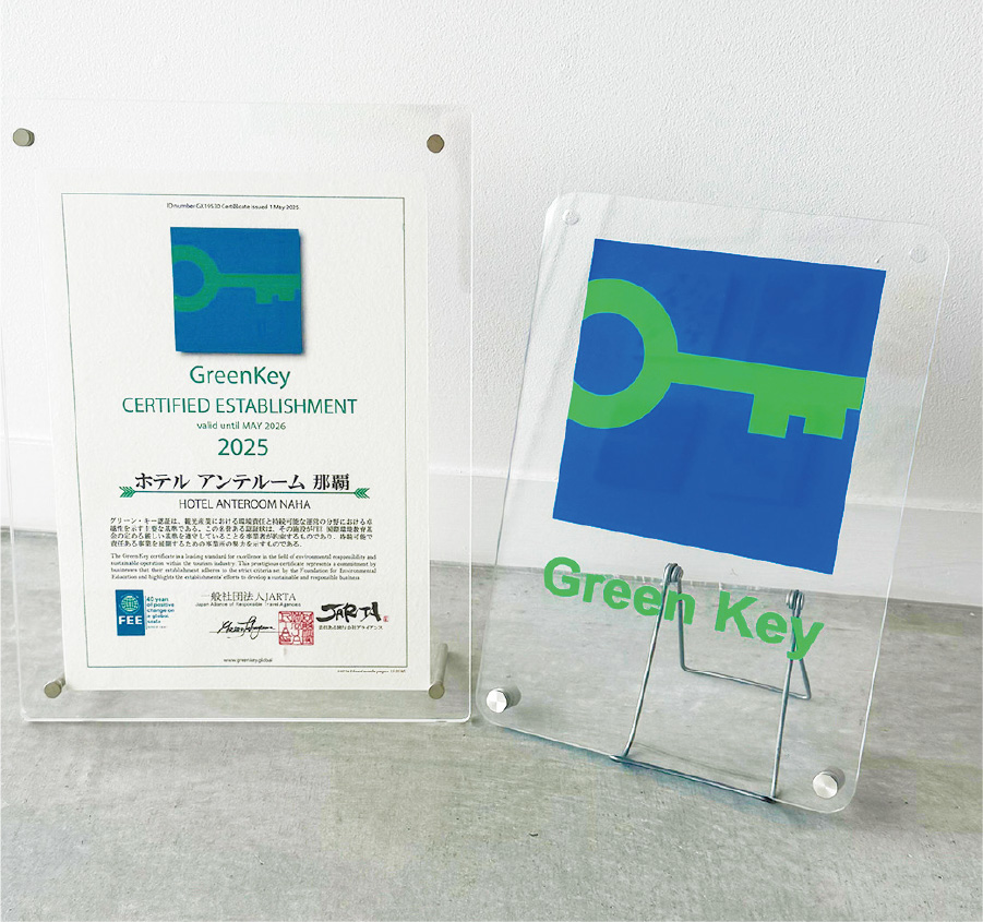 沖縄UDS株式会社が運営するホテルアンテルーム那覇は、2025年5月1日、沖縄県内のホテルとして初めてのグリーンキー(Green Key)認定を取得しました。グリーンキーとは、観光業界における持続可能な運営を推進することを目的とした、国際的に信頼される環境認証です。ホテルは、2020年2月に開業しましたが、すぐにコロナ禍での休業を余儀なくされました。そんな状況の中で、今後は海外からの環境意識の高いお客様が増えることを想定し、グリーンキーの取得に向け、数年にわたり段階的にサステナブルな取り組みを推進していったそうです。
