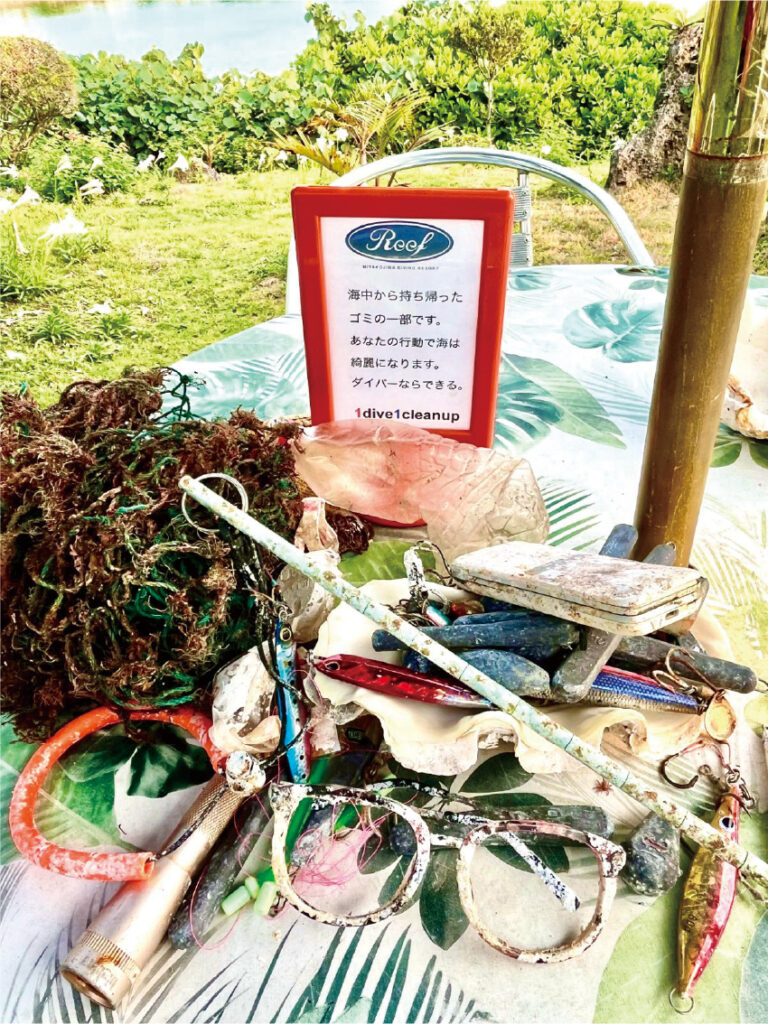 IRABU REEFでは「ワンダイブワンクリーンナップ」を実践しています。これは、1回海に出たら1つゴミを拾い持ち帰るという習慣で、定期的にダイバー仲間との一斉清掃も行っています。こうした取り組みは、地域や観光客への啓発にもつながります。
