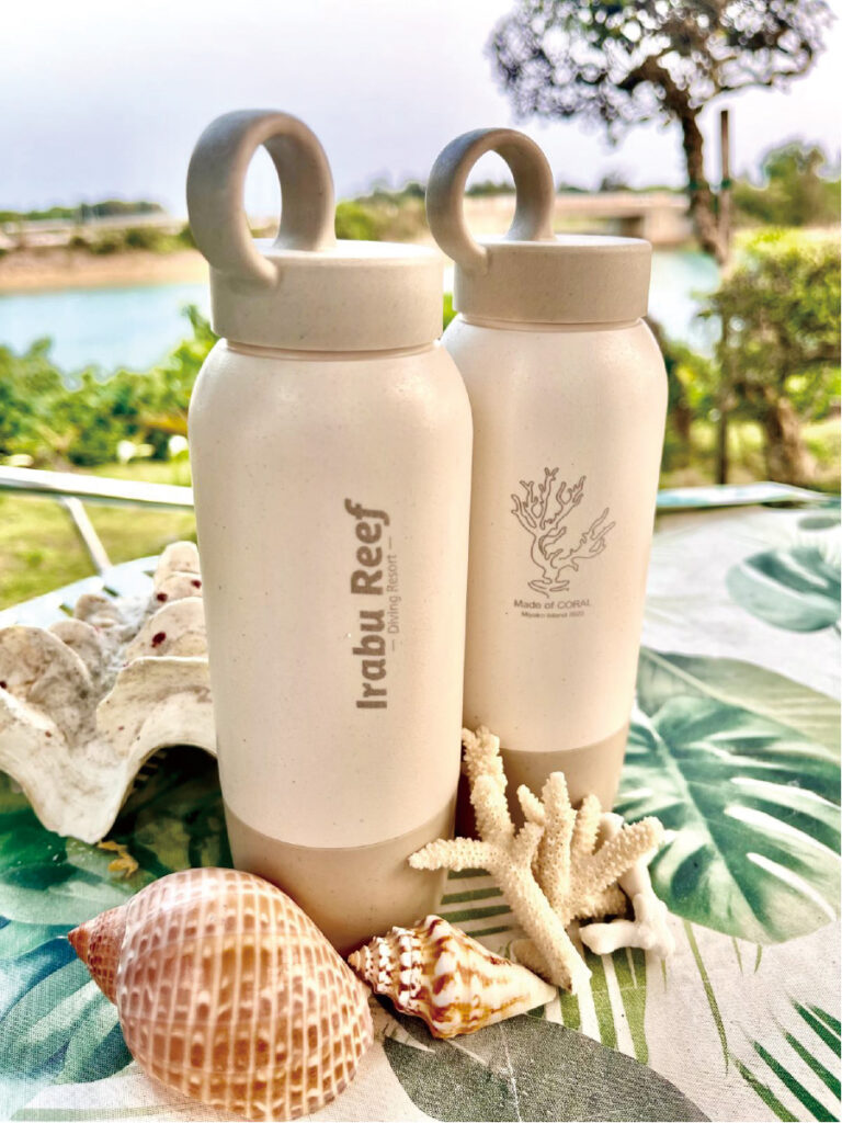 また、ショップではウォーターサーバーを設置し、ゲストにマイボトルを利用してもらうなど、日常の行動と環境保全を結びつける工夫もしています。さらに、伊良部島環境協会やアサヒ飲料と協力し、2022年と2023年の大量白化で死んでしまったサンゴと再生ペットボトルを使ったエコボトルを制作。