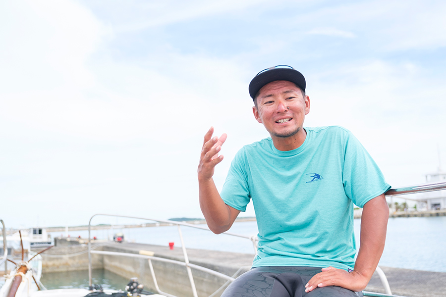 原さん:私は宮古に来て丸8年で、夏は池間島のダイビングショップ「azaikema diving service」、冬は漁師や農業をしながら、池間八重干瀬会の活動にも取り組んでいます。